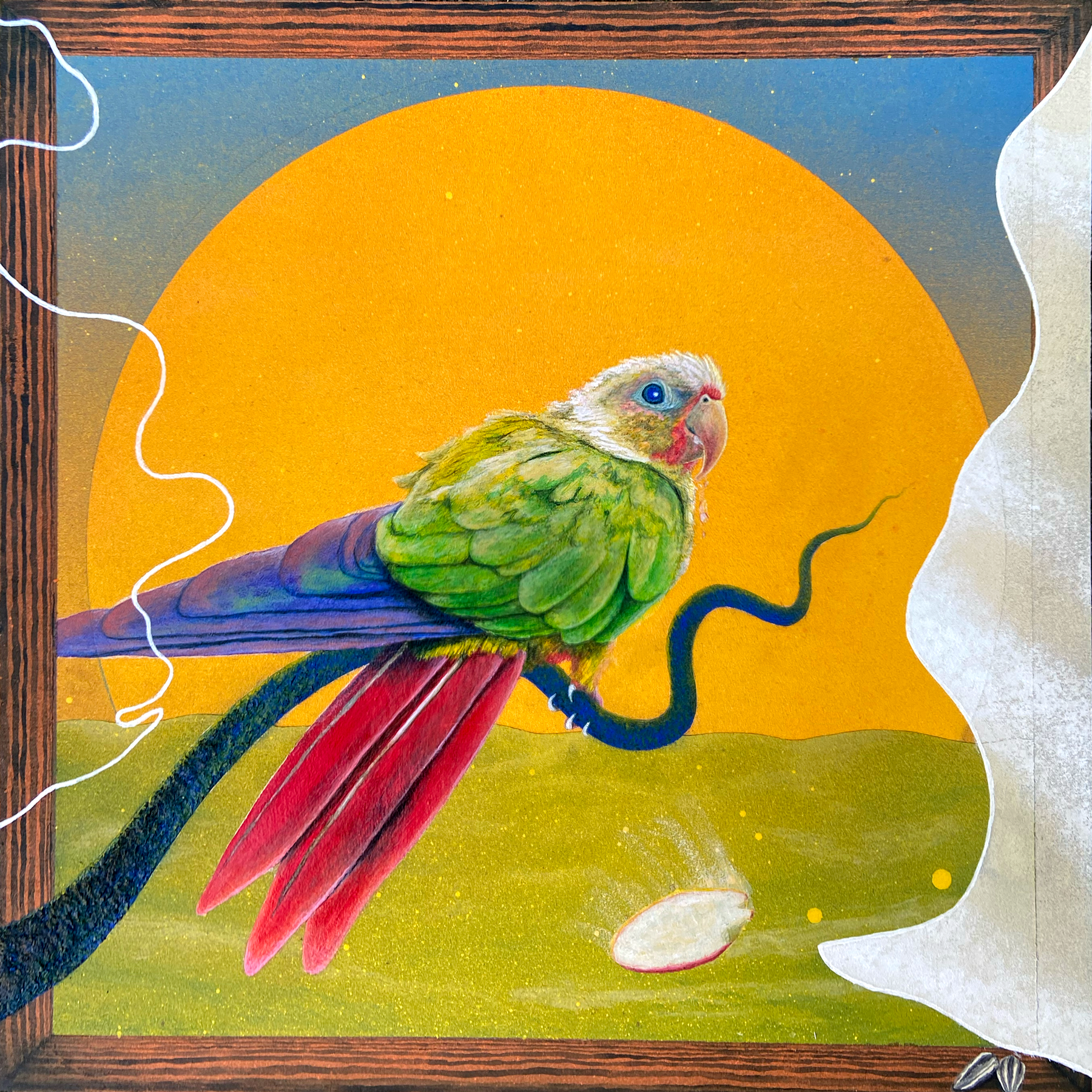 “An Offering at The Farm” 2019, acrylic, spray paint, and oil pastel on gesso board, 16 x 20 in